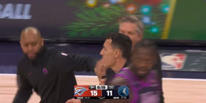 在首節比賽進行到還剩6分19秒時,愛德華茲此前反擊上籃不中,蘭德爾搶到籃板,但被杰倫給搶走球權。此時,森林狼主帥芬奇極為不滿,他認為此前愛德華茲的上籃應該給哨,而裁判沒有任何吹罰。