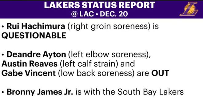 北京時間12月20日,湖人和快船更新了明日洛城德比的傷病報告,此前因小腿傷病休戰一場的哈登,確定可以出戰本場比賽。具體傷病名單如下——